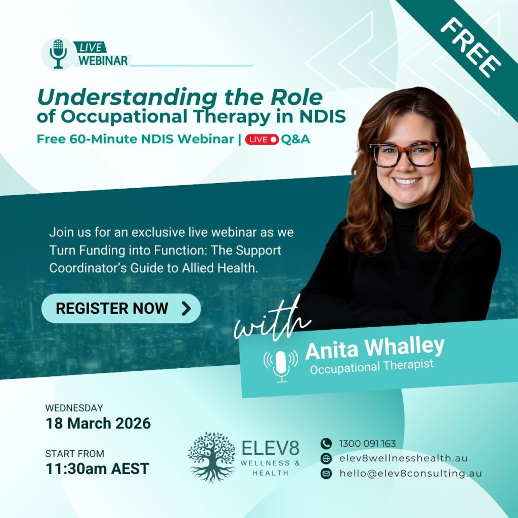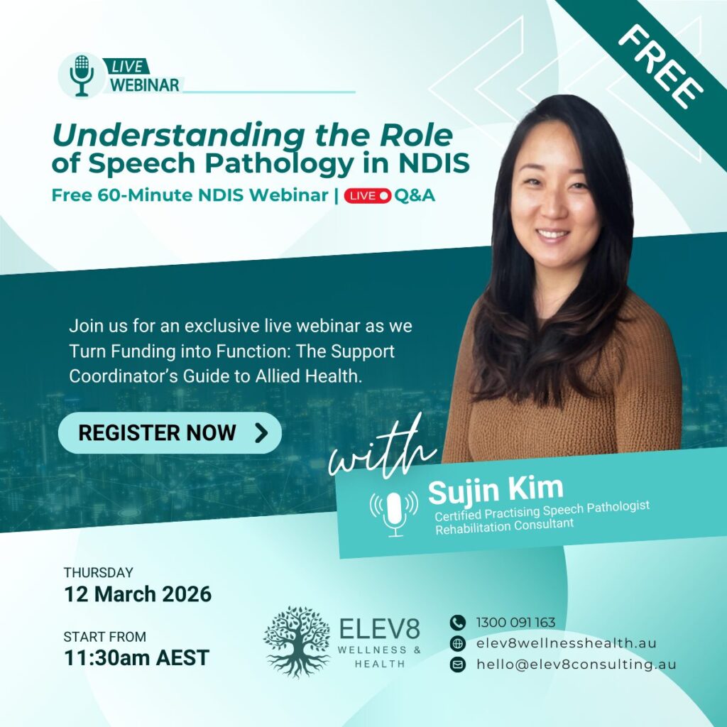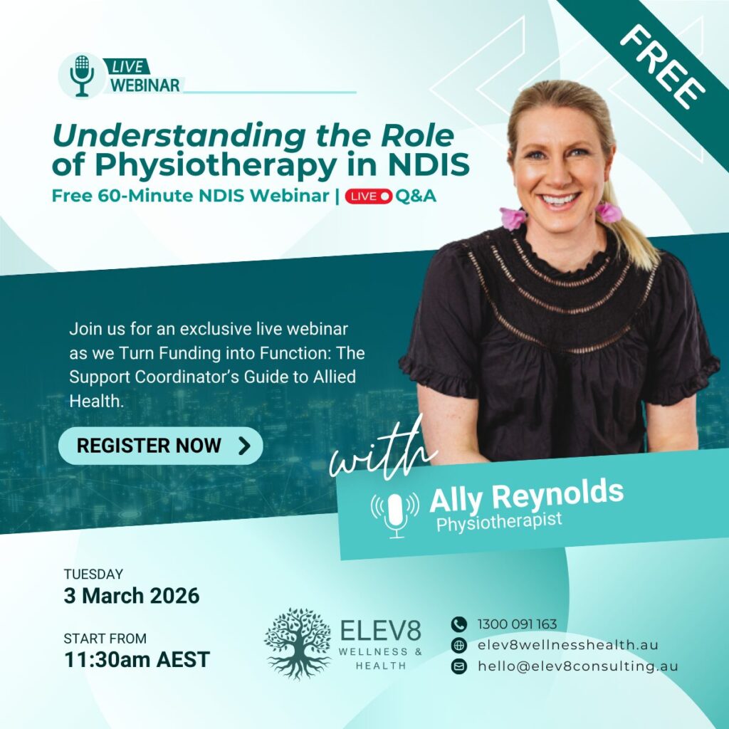 Join ELEV8 Wellness and Health Therapists for a free 60-minute live NDIS webinar series designed to help Support Coordinators and allied health professionals better understand how physiotherapy, speech pathology, and occupational therapy support functional outcomes under the NDIS.
